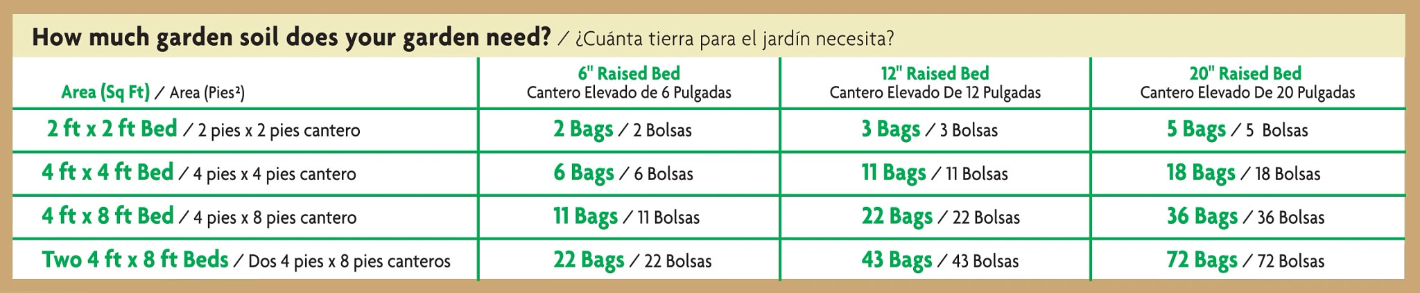 The amount of soil you need to purchase to fill your raised bed garden depends on the size and depth of your bed. Use this handy chart as a guide.